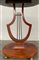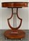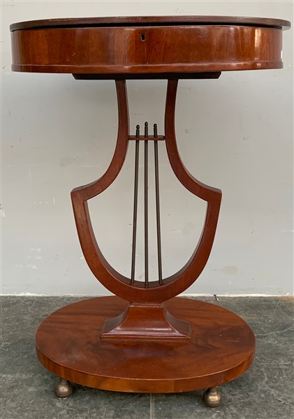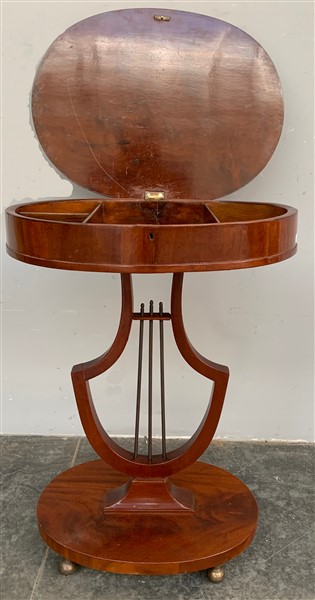 Tavolino lastronato in mogano. Piano apribile e base ovale. Sostegno a forma di lira, piedi a sfera (cm 53x71x40) (difetti)