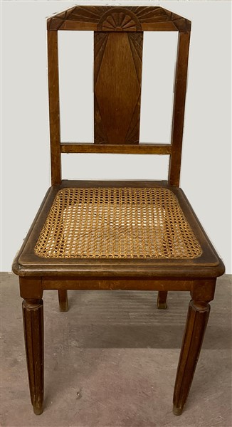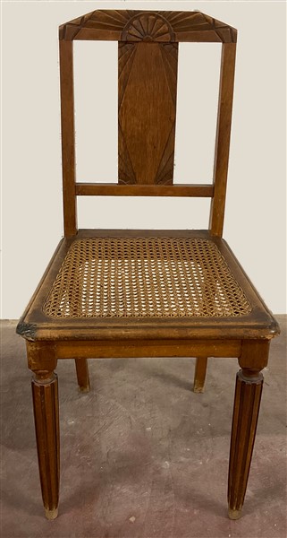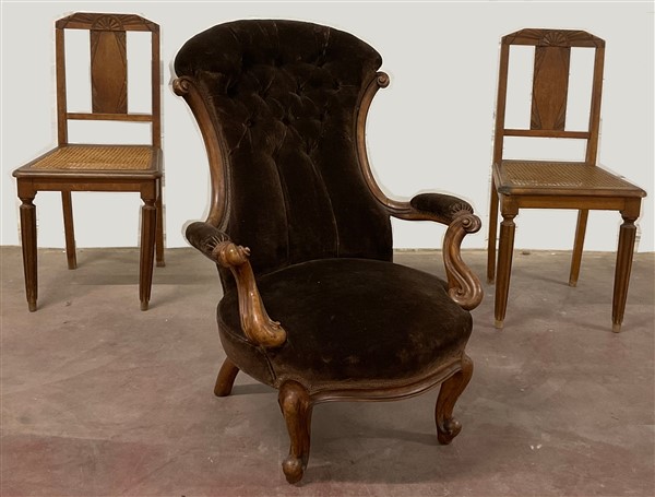 Lotto composto da una poltrona di forma mossa e due sedie in noce intagliato con seduta incannucciata (difetti)