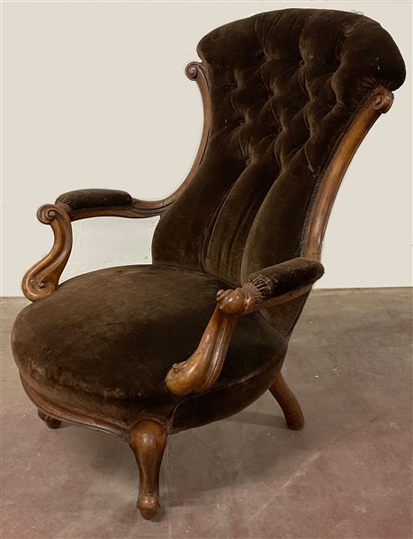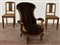 Lotto composto da una poltrona di forma mossa e due sedie in noce intagliato co