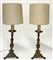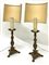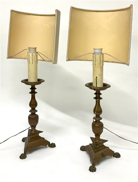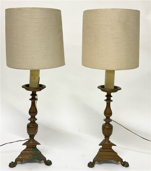 Coppia di candelieri in bronzo con fusto a rocchetto e base triangolare su piedi ferini. Secolo XVII (h. cm 35) Adattati a lampada in epoca posteriore (difetti)
