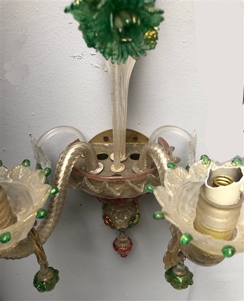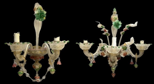 Due applique in vetro policromo con inclusioni in oro a due e tre bracci con fo