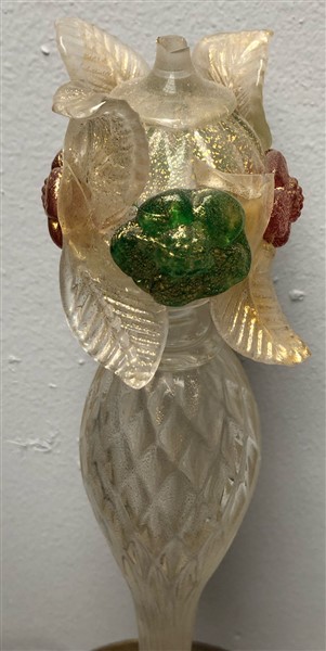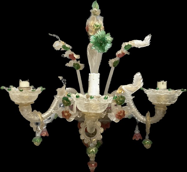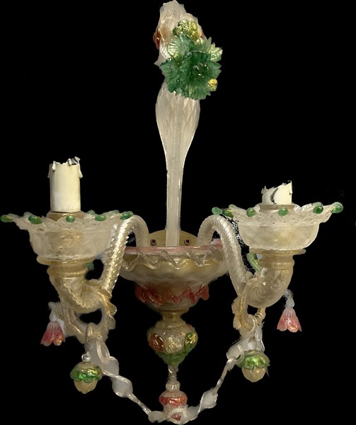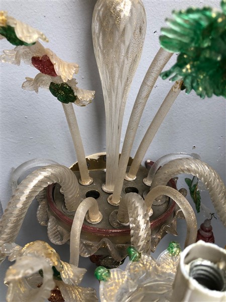 Due applique in vetro policromo con inclusioni in oro a due e tre bracci con foglie e fiori, raccordi a catenella. Murano, secolo XX (h. max cm 47) (difetti e mancanze)