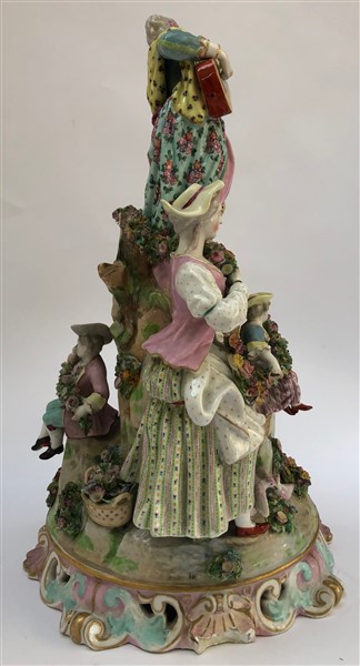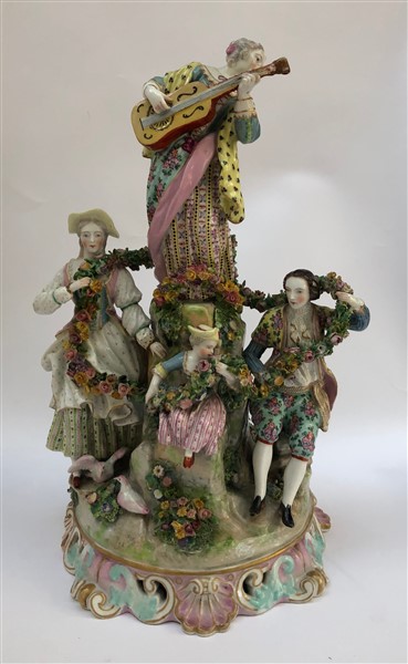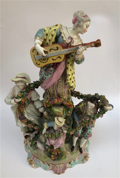 Manifattura tedesca, gruppo in porcellana dipinta in policromia raffigurante allegoria della Musica (cm 25x42) (difetti)