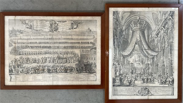 [FUNERALIA - STUART, James Francis Edward (1688-1766)] Le 2 grandi tavole ripiegate estratte da "Funerali di Giacomo III re della Gran Brettagna. Roma: Salvioni, 1766". Entro cornice (difetti e segni di piegature). La grande tavola che raffigura l'apparato effimero realizzato in San Pietro per i funerali è di Giuseppe Vasi mentre la tavola che raffigura la processione verso la basilica è derivata dalla stessa usata per i funerali della consorte Maria Clementina, nel 1736. [1]