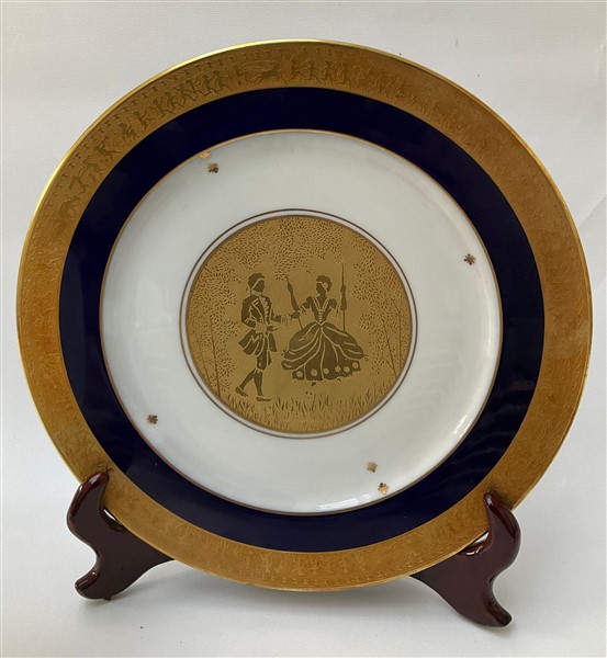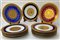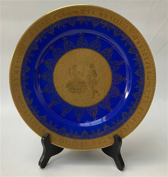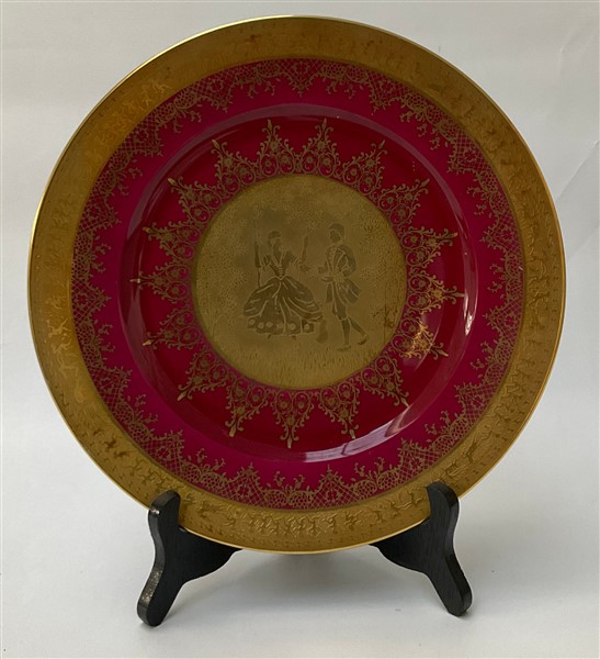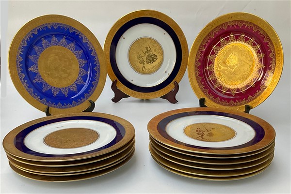 Lotto composto da quattordici piatti in porcellana con decoro in oro a scene galanti e motivi stilizzati, dei quali undici con bordura in blu, due a fondo rosso e uno a fondo blu. Marcati al retro J.K. W Carlsbad (d. cm 26,5)