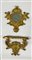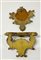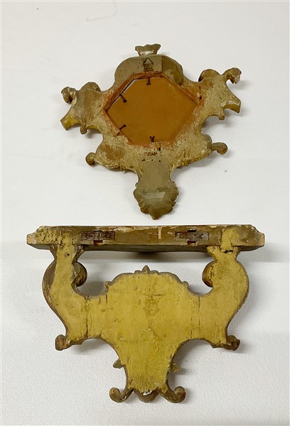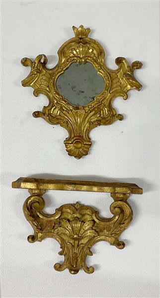 Lotto composto da un'antica mensola e una specchierina in legno intagliato e dorato a volute contrapposte e fogliate (restauri) (mensola: L cm 35,5; specchiera H cm 40)