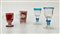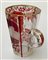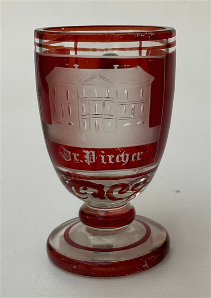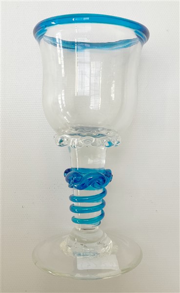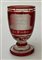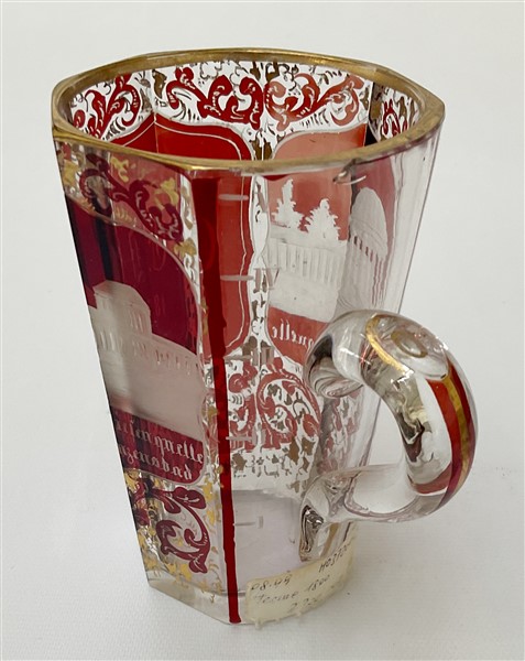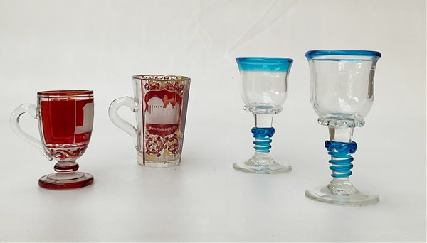 Lotto composto da due diversi bicchieri ad un'ansa in vetro inciso e molato in parte a fondo rosso decorati a vedute architettoniche dei quali uno datato 1877 con profili in oro, manifatura di Boemia, secolo XIX. Uniti a due calici in vetro soffiato con bordure e applicazioni in blu (h. max cm 13,2) (lievi difetti)