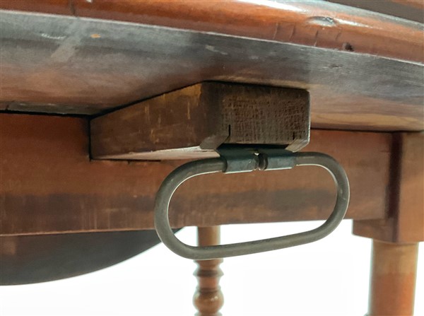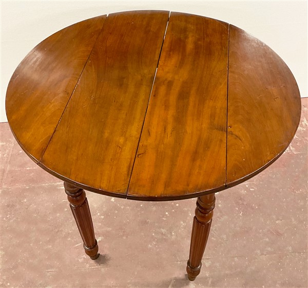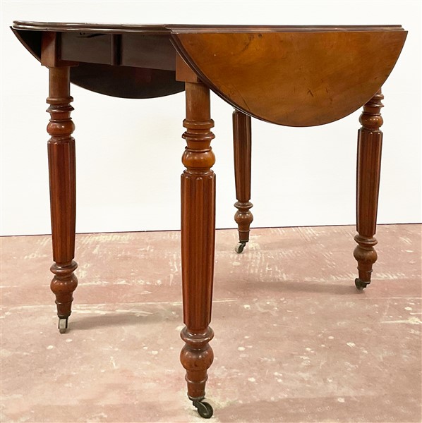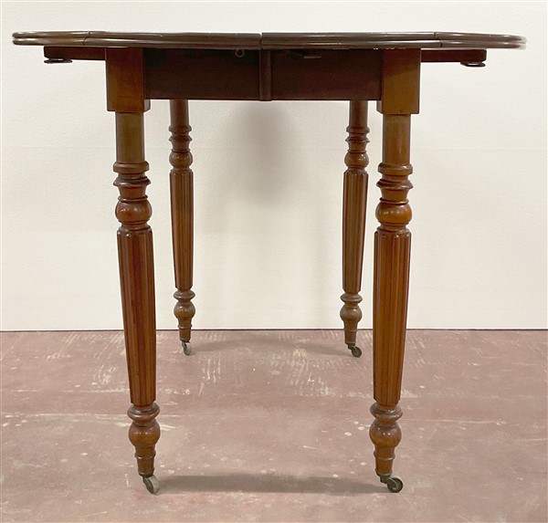 Tavolo a bandelle allungabile in mogano con gambe tornite e scanalate terminanti a rotelle. Secolo XIX (chiuso cm 97x77,5x53,5; aperto lunghezza cm 96) (difetti, mancante delle prolunghe)