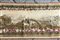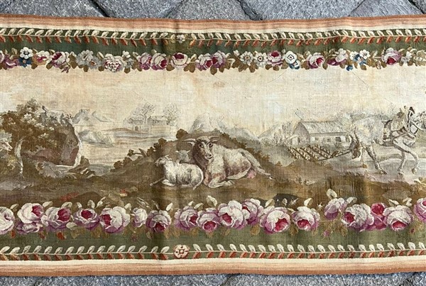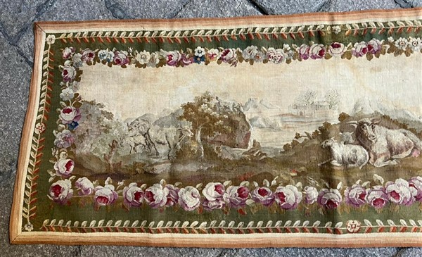 Arazzetto Aubusson, Francia, secolo XVIII - XIX. Decorato da paesaggio bucolico con cavalli ed armenti contornato da una ghirlanda di rose policrome su fondo verde reseda (cm 182x63) (difetti)