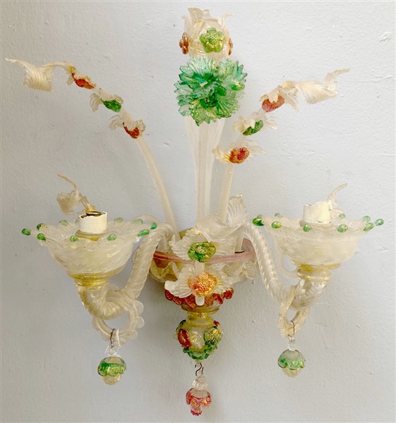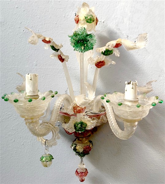 Coppia di applique in vetro policromo con inclusioni in oro a due bracci con fo