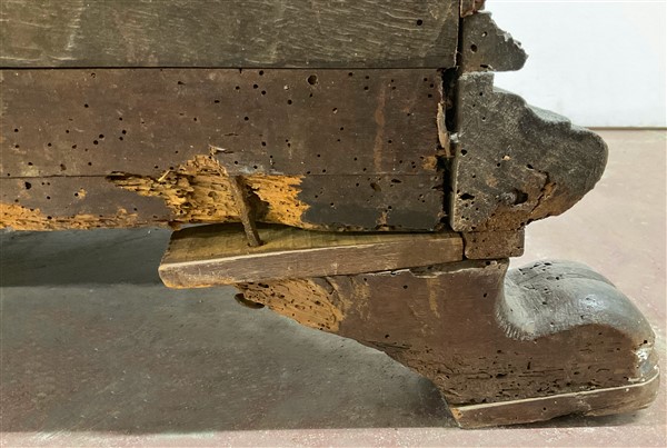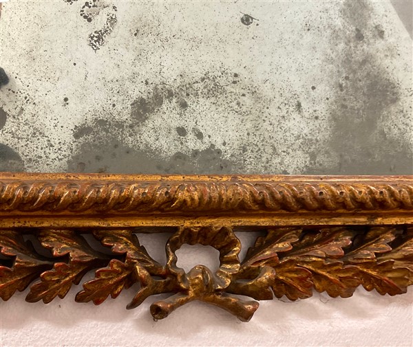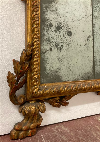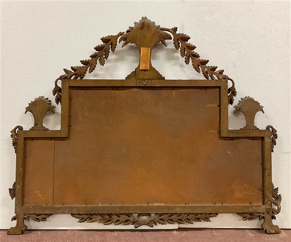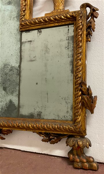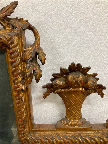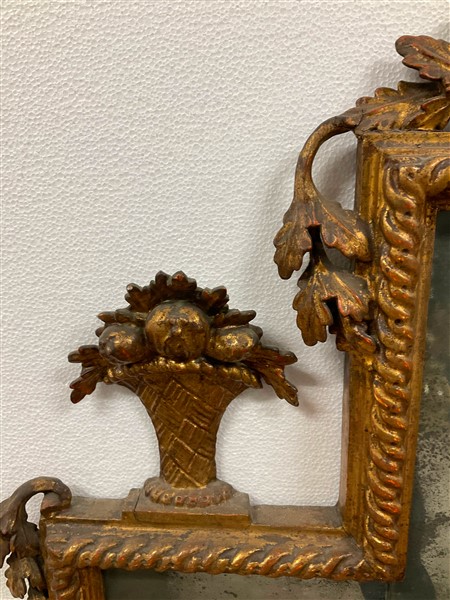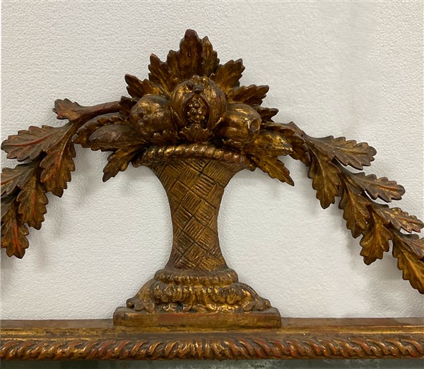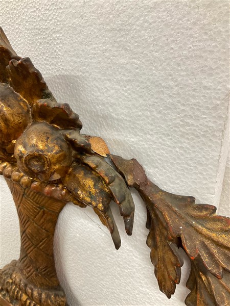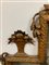 Caminiera in legno intagliato e dorato sormontata da vasi tra ghirlande di foglie. Piedi ferini (cm 177x96) (difetti e restauri)