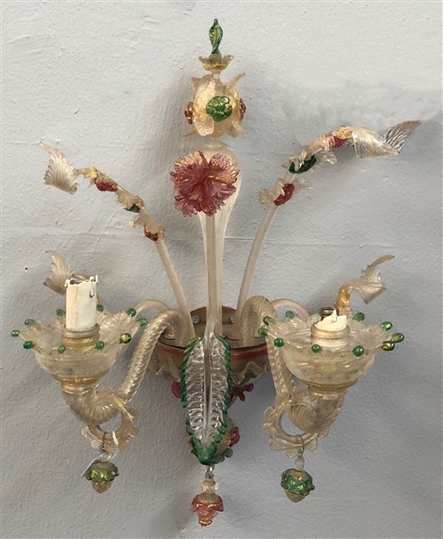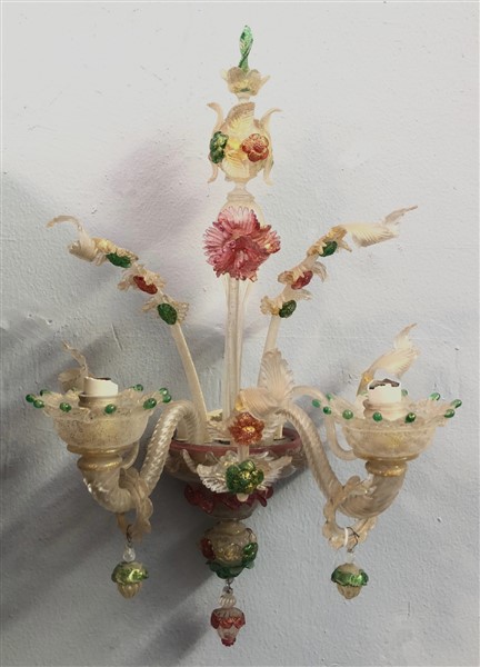 Coppia di applique in vetro policromo con inclusioni in oro a due bracci con foglie e fiori. Murano, secolo XX (h. max cm 58) (difetti e mancanze)