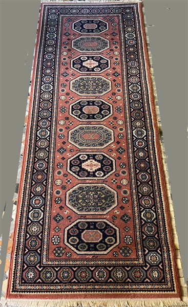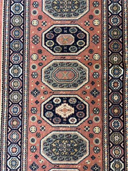 Tappeto meccanico di recente manifattura. Decorato da medaglioni ottagonali su fondo rosa (cm 225x83) (difetti)