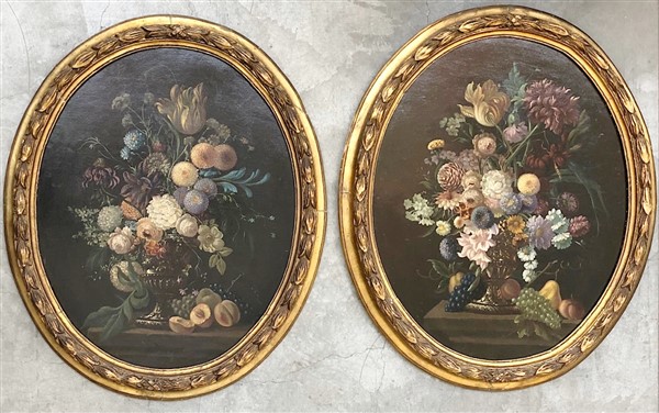 Ignoto, coppia di dipinti ovali a olio su tela raffiguranti vasi con fiori e fr