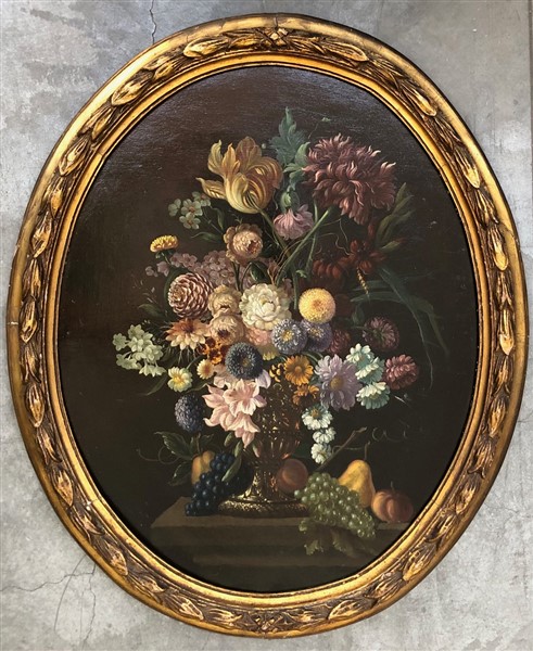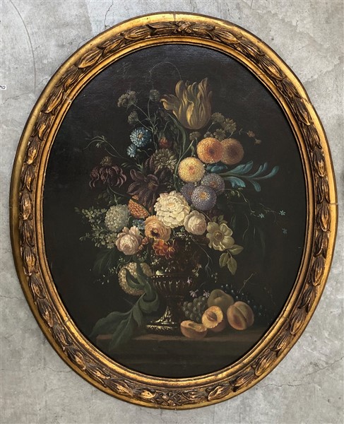 Ignoto, coppia di dipinti ovali a olio su tela raffiguranti vasi con fiori e frutti (cm 78x62,5) in cornici (difetti e mancanze)