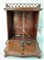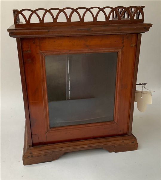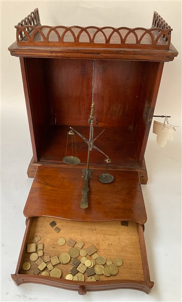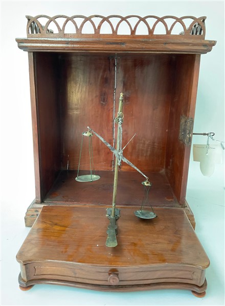 Bilancia per orafo entro vetrina in legno con anta a vetro, sormontata da ghiera traforata. Allegati pesi vari. Secolo XIX (cm 42,5x50x28,5) (difetti)