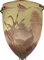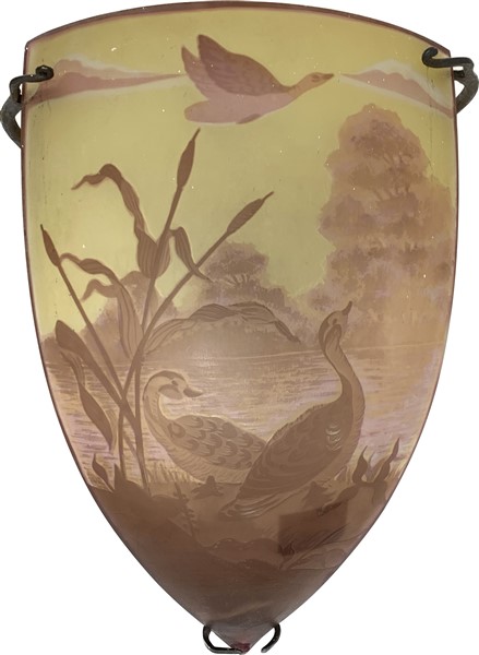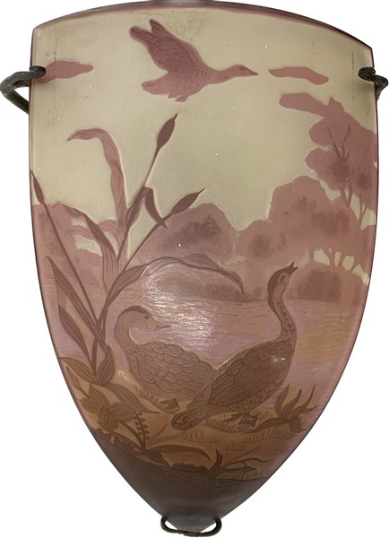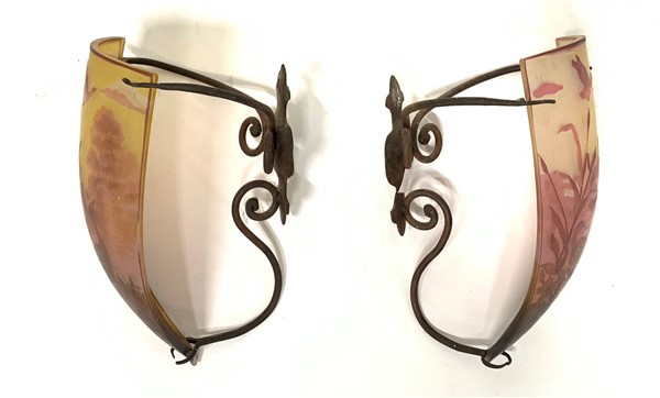 Coppia di applique in vetro a cammeo inciso all'acido nei toni del rosso e giallo con paesaggio acquatico e volatili. Montatura in ferro forgiato. Secolo XX. Recanti firma incisa Gallè. (h cm 26)