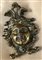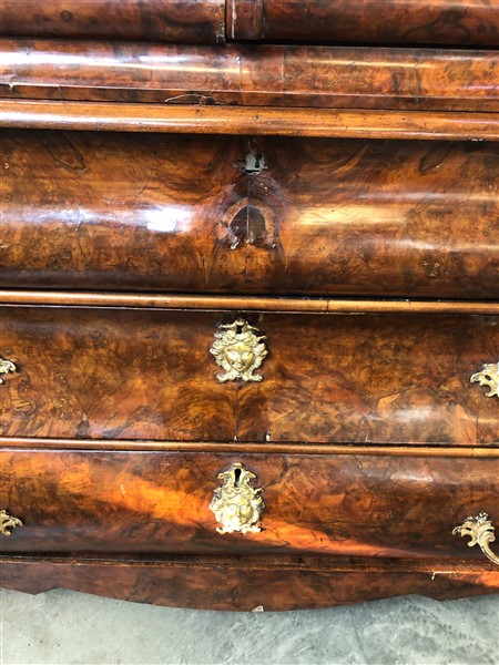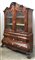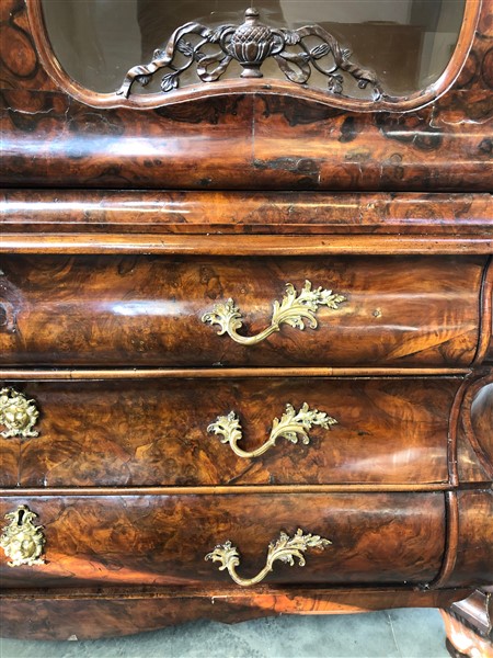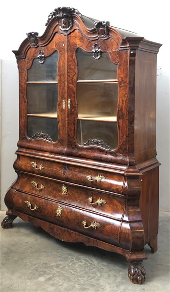 Mobile a doppio corpo di forma bombata lastronato in mogano e radica con parte inferiore a tre cassetti con serrature a mascheroni, piedi ad artiglio su sfera. Parte superiore a due ante a vetro decorate da vasi, festoni e ghirlande. Cimasa scolpita e traforata, centrata da profilo di gentiluomo. Olanda, inizio secolo XIX (cm 190x251x69) (difetti)