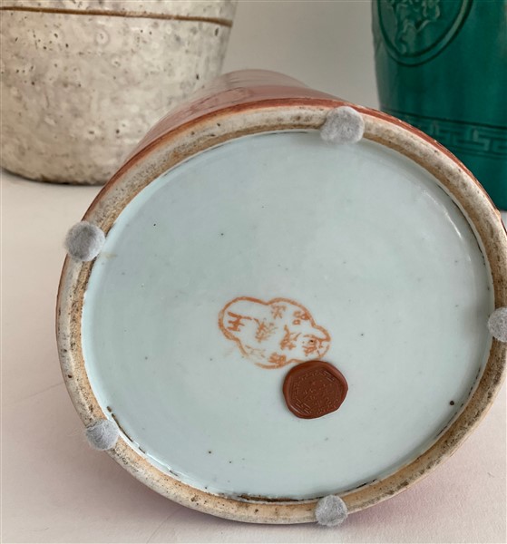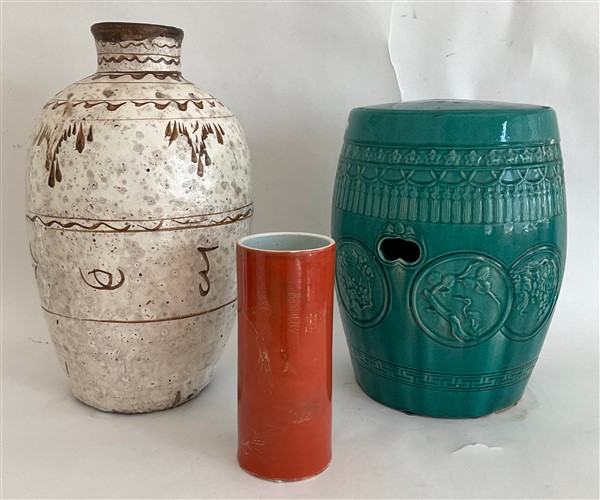 Lotto composto da un garden seat in porcellana invetriata verde smeraldo, un vaso cilindrico in porcellana a fondo rosso-ferro con decori in oro e un vaso in ceramica Cizhou