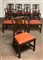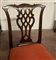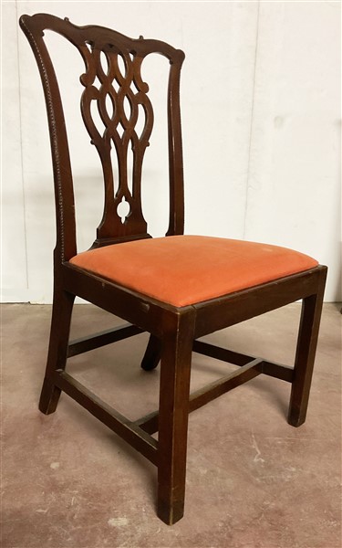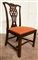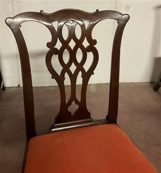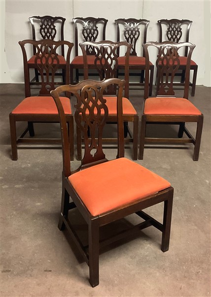 Gruppo di otto sedie in mogano intagliato con schienale traforato e seduta in tessuto rosso. Gambe unite da traverse (difetti)