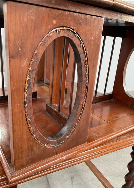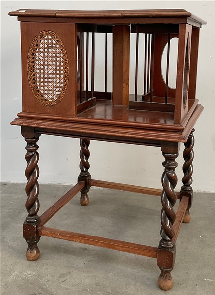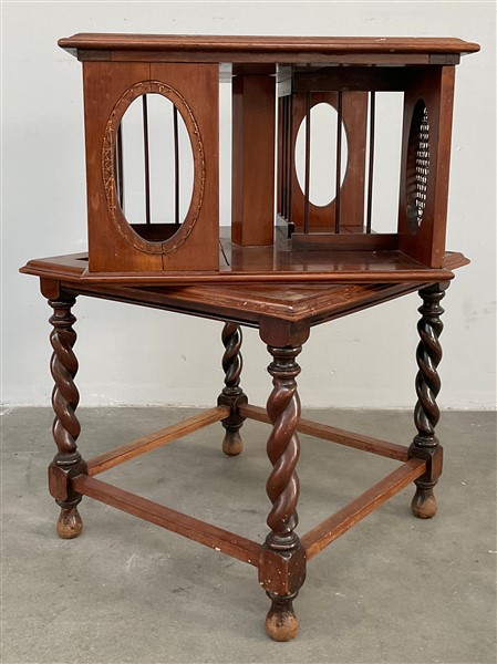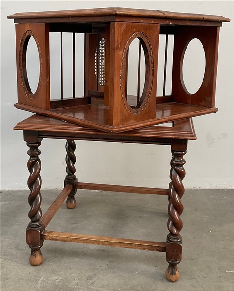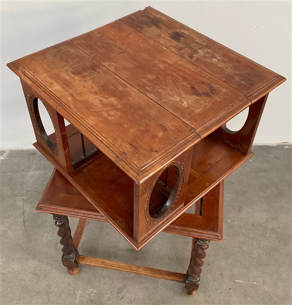 Libreria in mogano, parte superiore girevole, parte inferiore a quattro gambe tortili riunite da traverse dritte. Inghilterra, inizio sec XX (cm 50x75x50) (difetti)