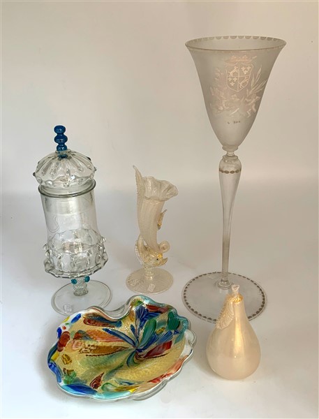 Lotto composto da un posacenere, un contenitore con coperchio, un calice a collo lungo, una pera e un calice con montante a delfino, manifattura e colori differenti. Secolo XX. (h max cm 40) (difetti)