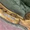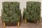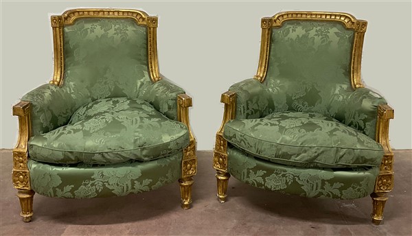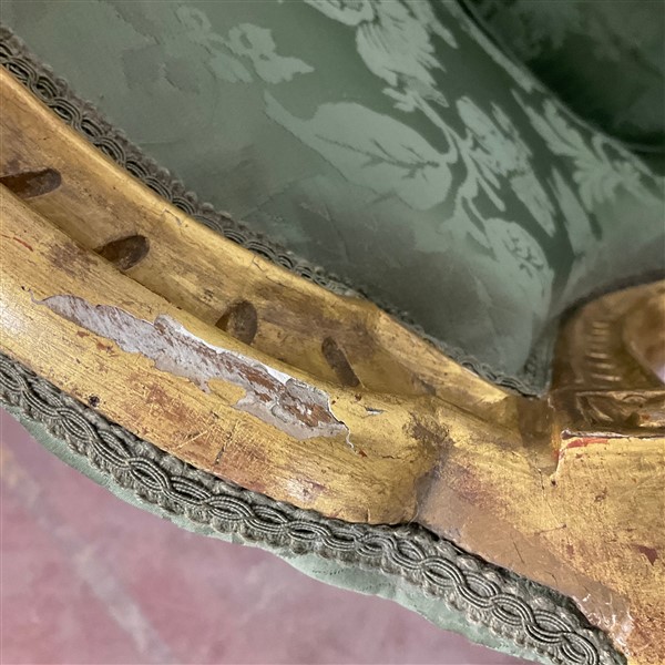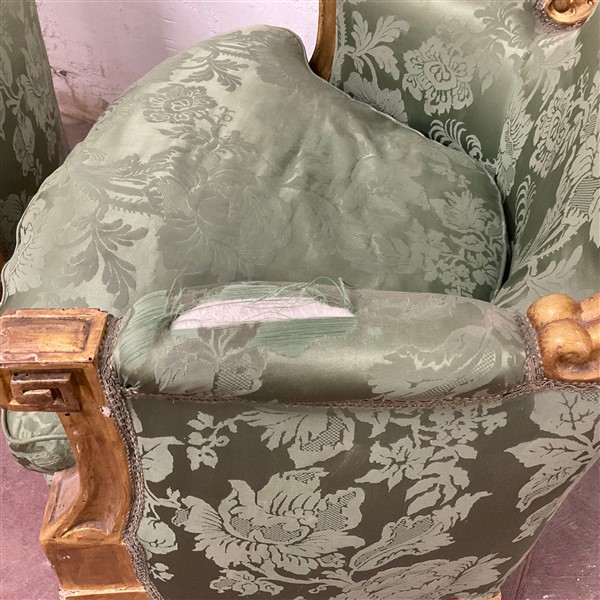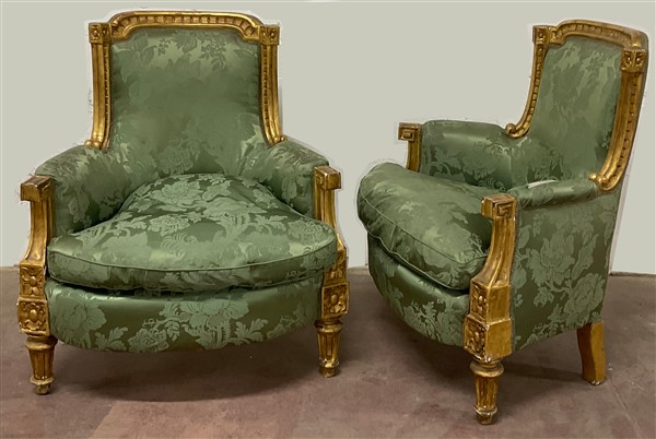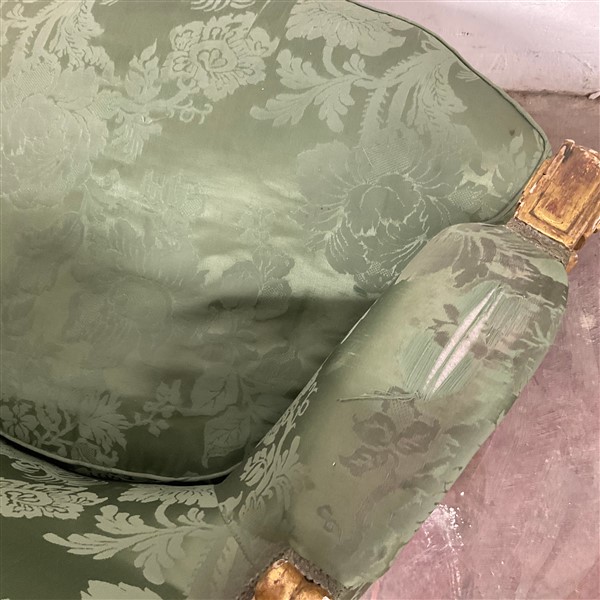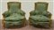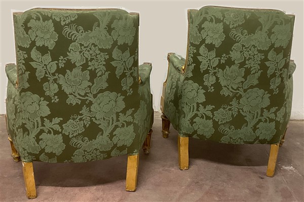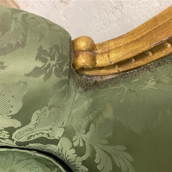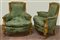 Coppia di poltrone in legno intagliato e dorato, gambe rastremate e scanalate, rivestimento in tessuto operato verde. Secolo XIX (cm 83x90x58 circa) (difetti e restauri)