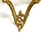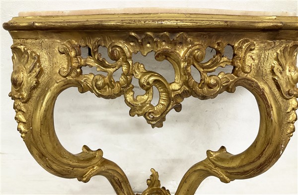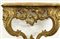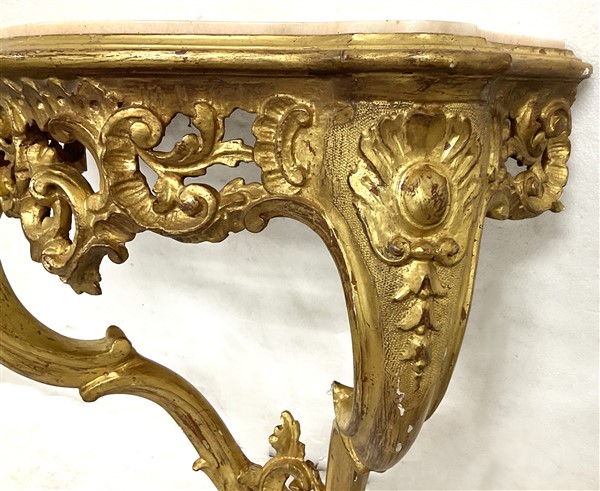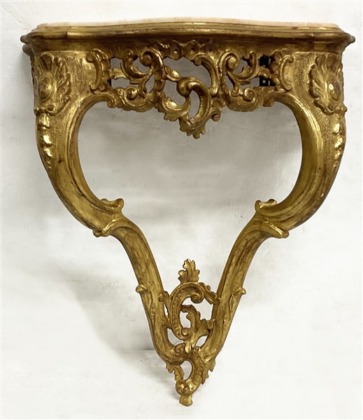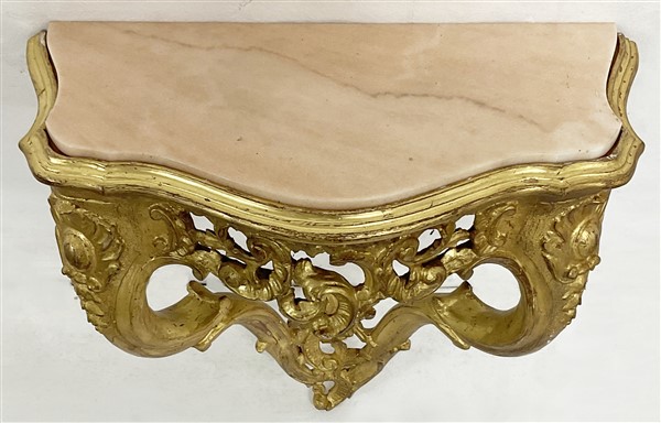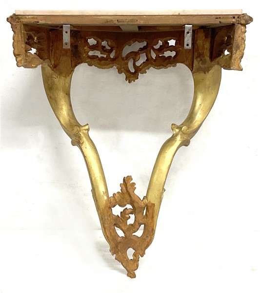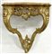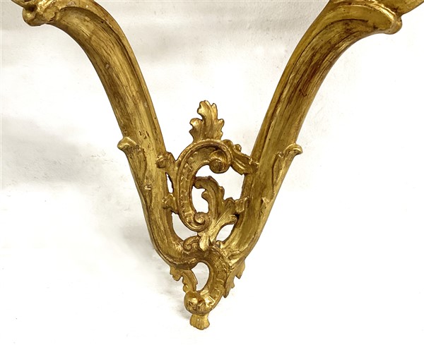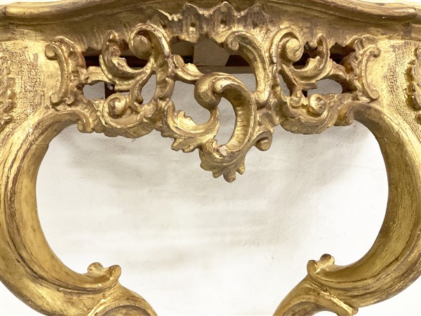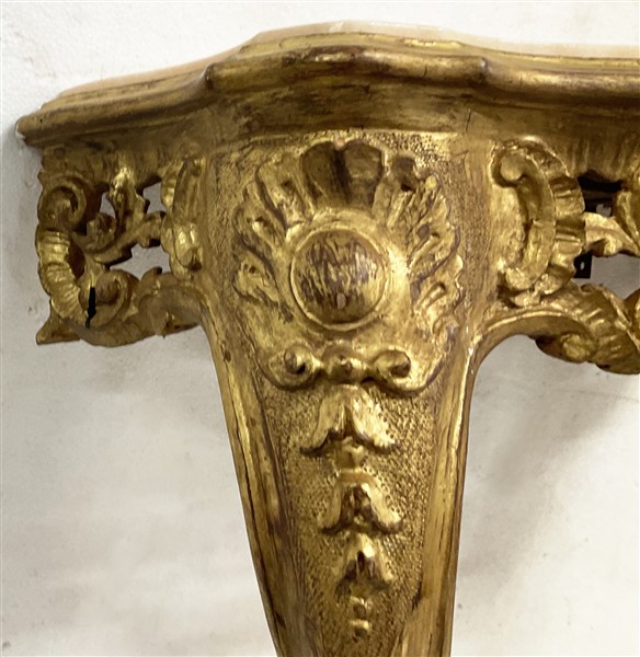 Coppia di console pensili di forma mossa in legno intagliato e dorato a volute