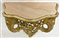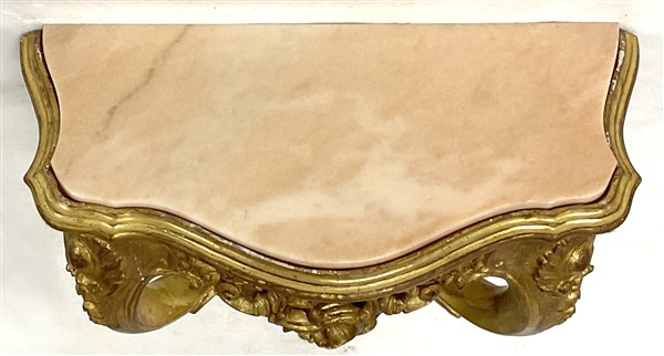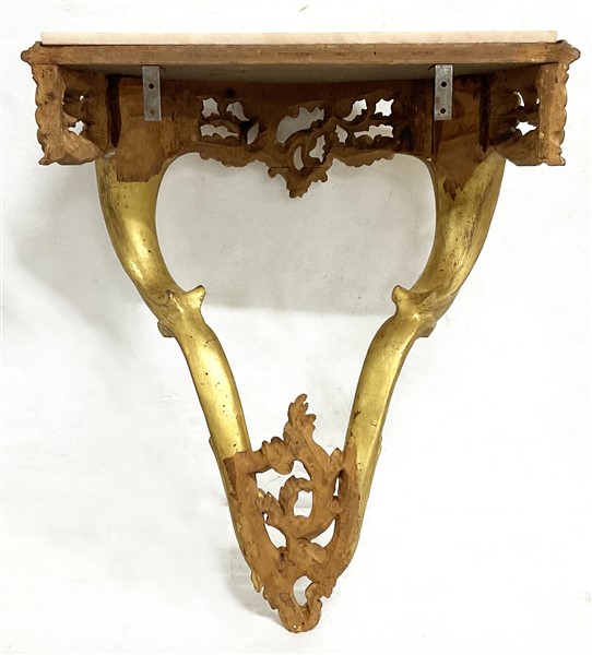 Coppia di console pensili di forma mossa in legno intagliato e dorato a volute e motivi vegetali. Fascia traforata, piani in onice (cm 54x56x26) (difetti)