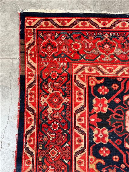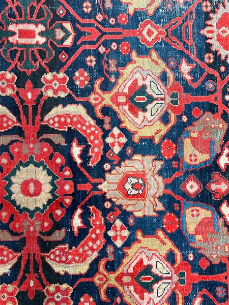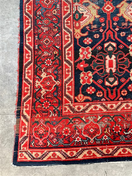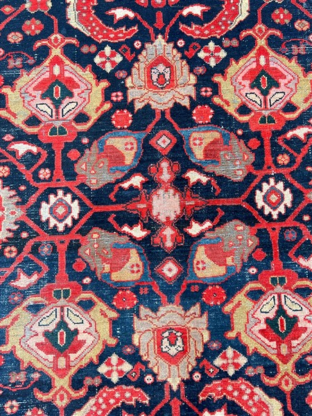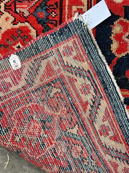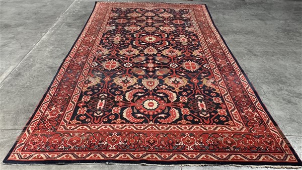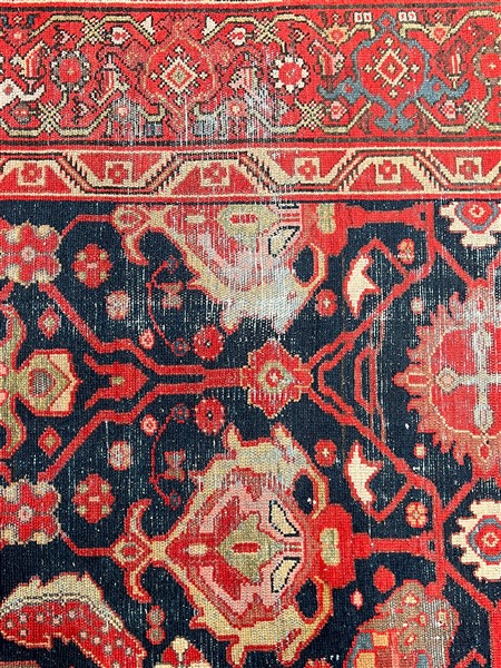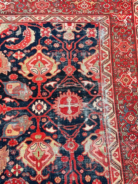Tappeto Ferahkan, Persia, inizio secolo XX. Decoro all over policromo su fondo blu notte. Bordura Herati su fondo rosso (cm 399x241) (difetti e rapature)