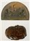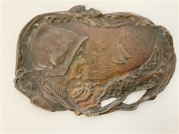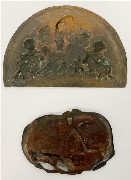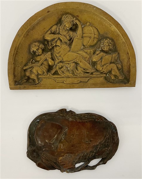 Lotto composto da due placche in bronzo, una a mezza luna con figure allegoriche ed una sagomata a profilo femminile con cuffia entro veduta costiera. Secolo XIX-XX (cm 23,5x15,5; cm 17x12) (difetti)