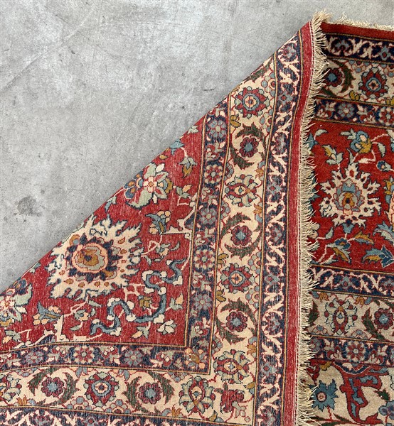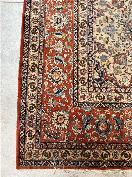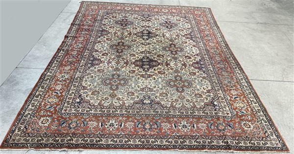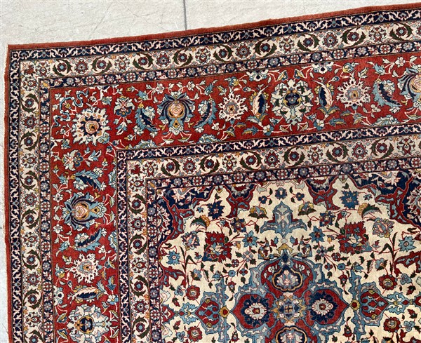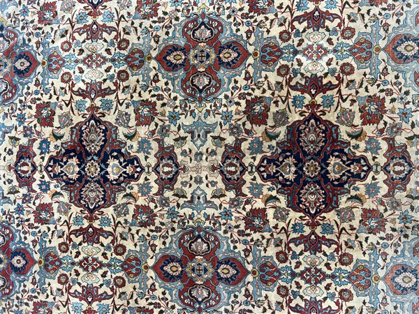 Tappeto Sarouk, Persia, secolo XX. Decoro all over con piccoli medaglioni bianchi su fondo azzurro (cm 330x241) (difetti)