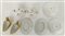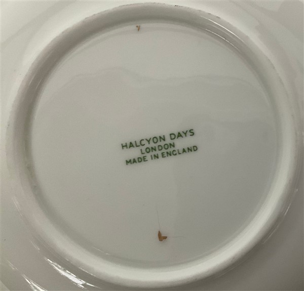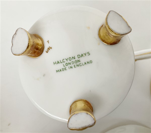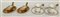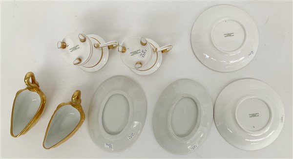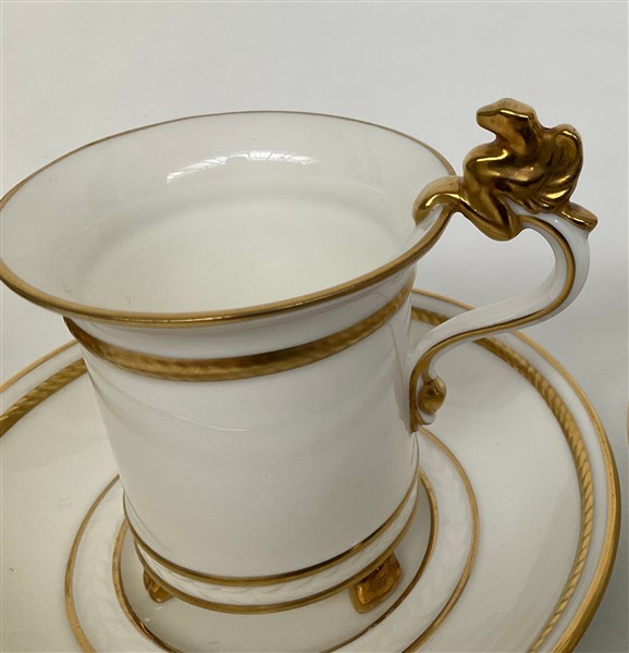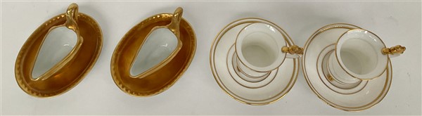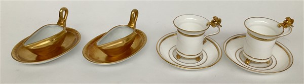 Due coppie di tazze con piatto in porcellana delle quali una coppia a forma di cigno. Bordure in oro. Manifatture differenti (lievi difetti)
