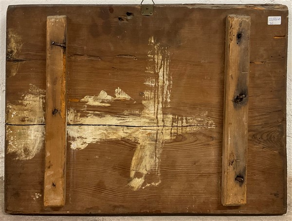 Antica icona a tempera su tavola con fondo oro raffigurante Salvator Mundi e Santi (cm 36,5x48,5) (gravi difetti)