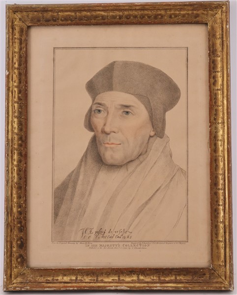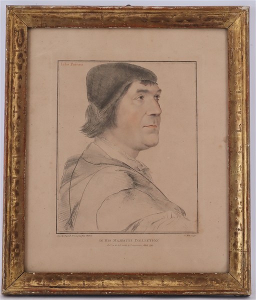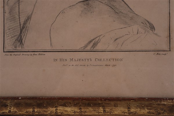 F. Bartolozzi da H. Holbein, ''John Fisher'' 1793, incisione all'acquaforte su carta (cm 40x30) e C. Metz da H. Holbein, ''Johan Poines'' 1792 incisione all'acquaforte su carta (cm 40x33); in cornici dorate (difetti)
