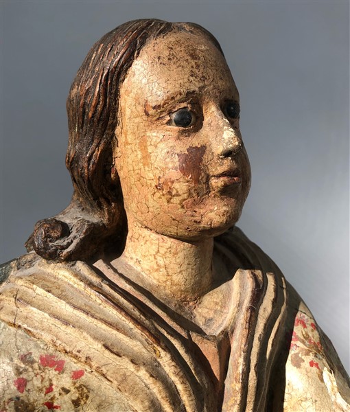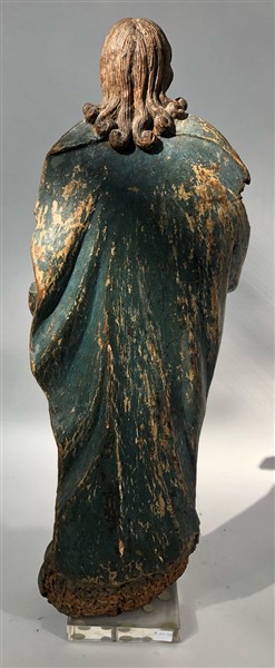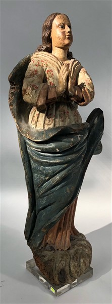 Manifattura dell'Italia meridionale, secolo XVIII. Madonna dell'Assunta, scultura in legno intagliato e dipinto in policromia con occhi in pasta vitrea (h. cm 68) su base in plexiglass (h. cm 2) (difetti e mancanze)
