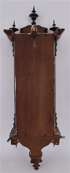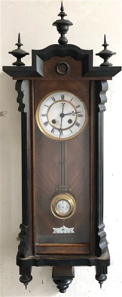 Orologio da parete con cassa in legno e vetri. Quadrante in smalto bianco a cifre romane. Movimento a due treni con suoneria delle ore e mezze su gong. Austria o Germania, fine secolo XIX (h cm 90) (difetti)