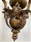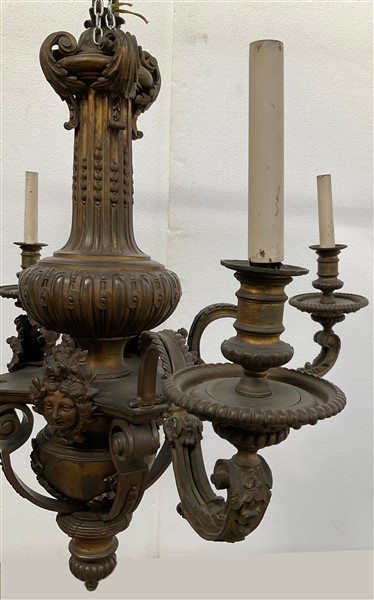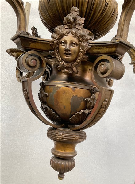 Lampadario in bronzo a quattro fiamme con corpo a balaustro decorato in rilievo a baccellature, volute e volti muliebri. Bracci sagomati a doppia voluta. Tracce di doratura (h cm 85) (difetti)