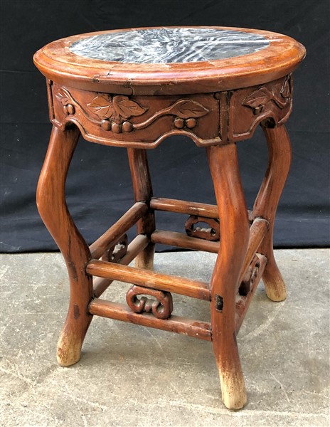 Tavolino tondo con fascia intagliata a foglie, gambe mosse riunite da traversa, pianetto in marmo grigio venato. Cina, sec. XX (cm 35x45)(difetti)