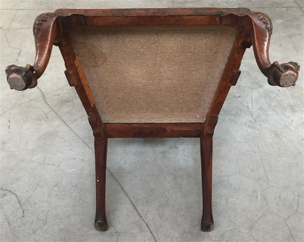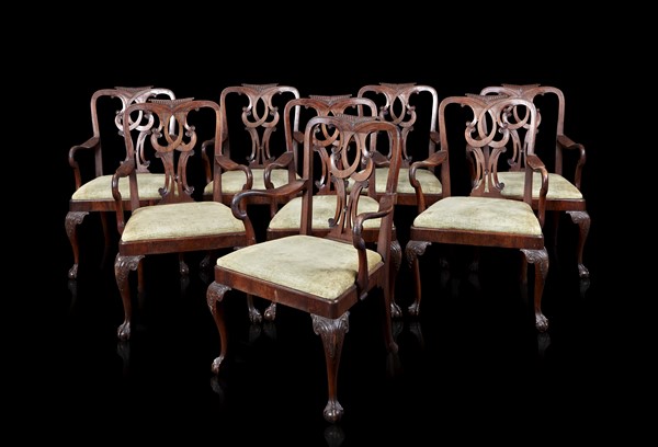 Gruppo di otto poltrone in noce con braccioli mossi, schienale traforato, gambe decorate a volute fogliate all'attacco e terminanti ad artiglio su sfera. Veneto, secolo XVIII (difetti)