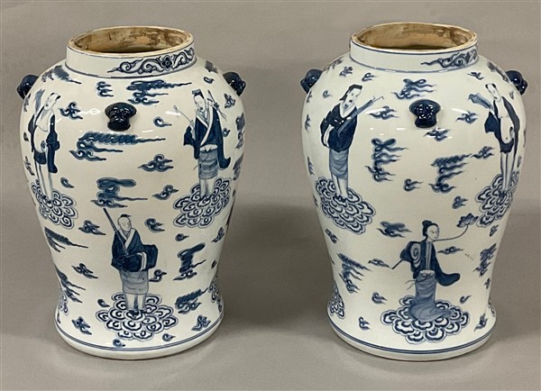 Coppia di vasi in porcellana bianca e blu decorati con figure degli otto immort