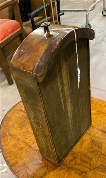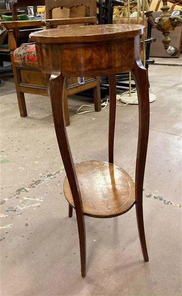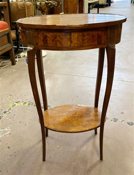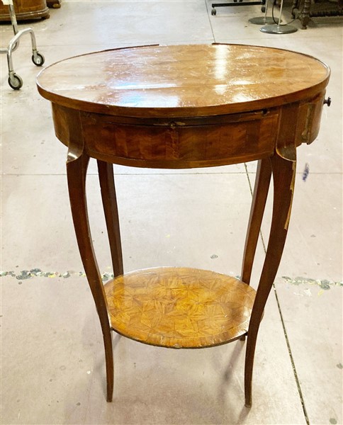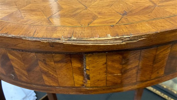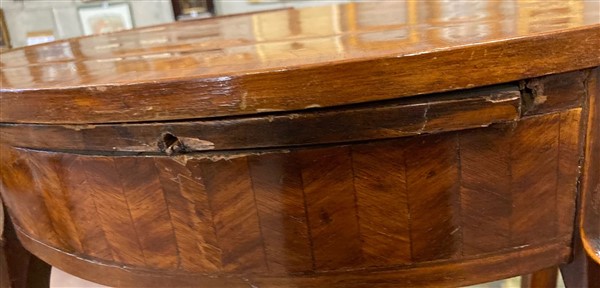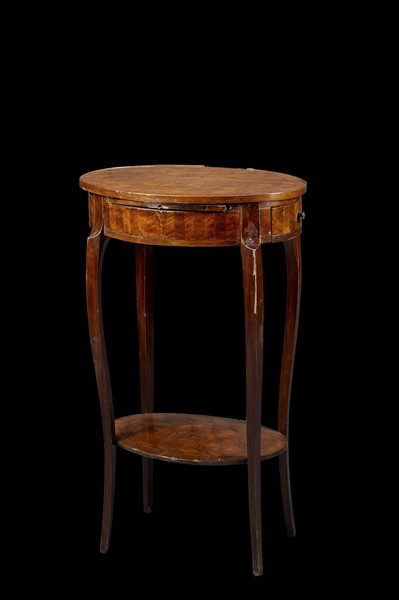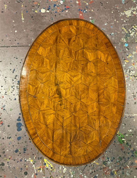 Tavolino da centro in rovere lastronato a motivi geometrici e filettato. Cassetto nella fascia, pianetto estraibile, gambe mosse unite da ripiano. Francia, secolo XVIII (cm 45x73x32) (difetti)