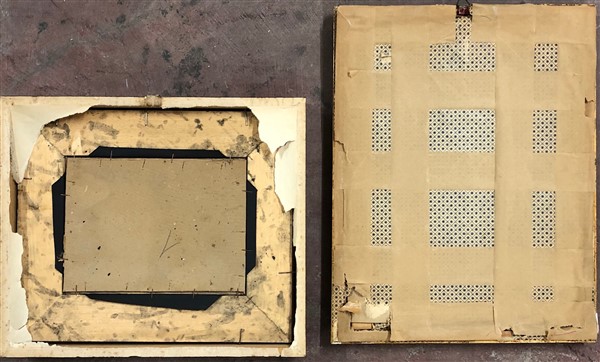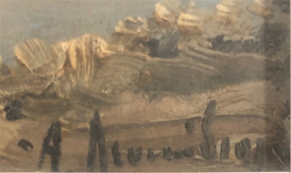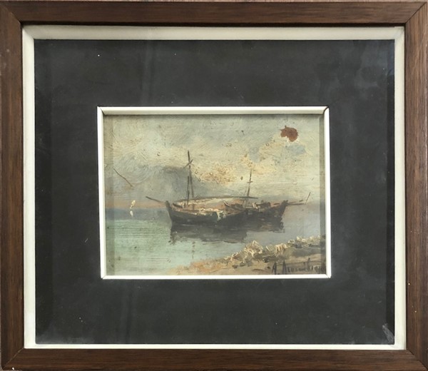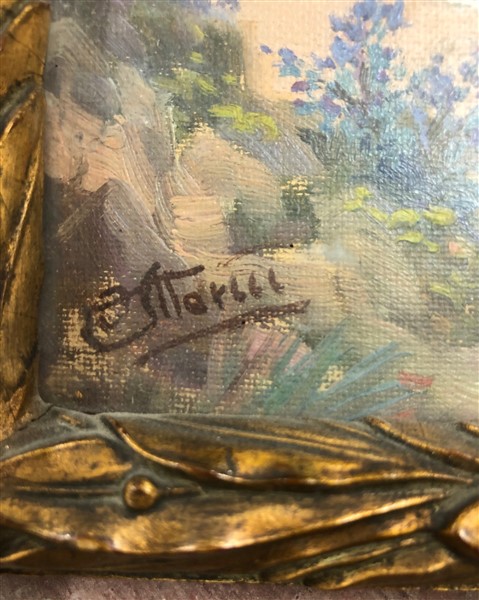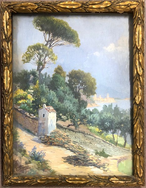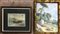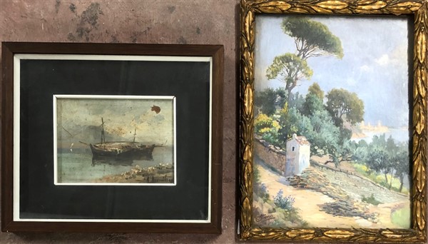 Lotto di due dipinti ad olio su cartone raffiguranti "Paesaggi", di diverse misure e diversi autori. Firmati in basso. In cornice (difetti)