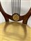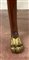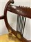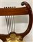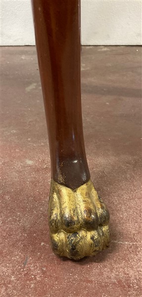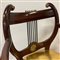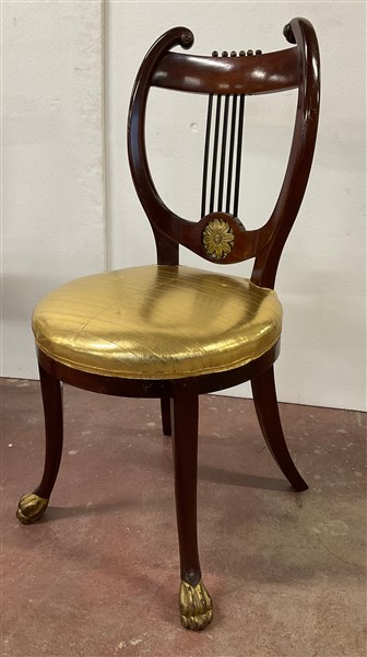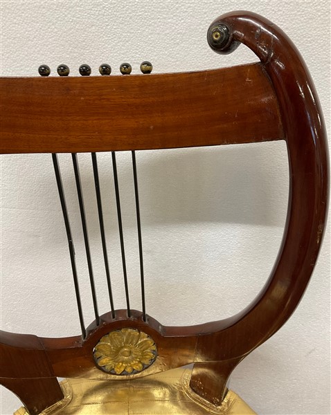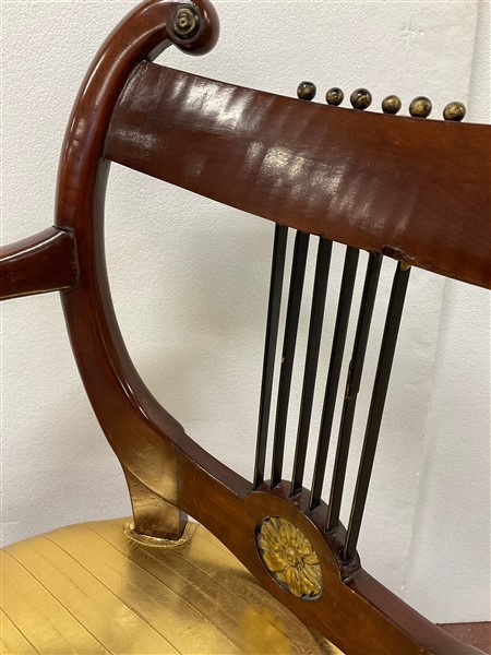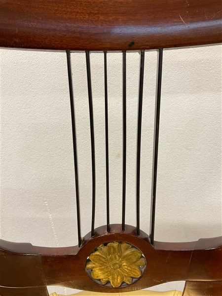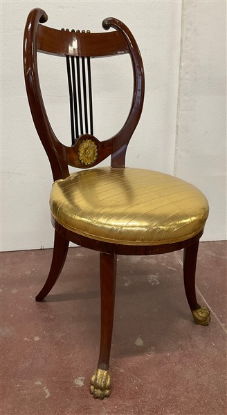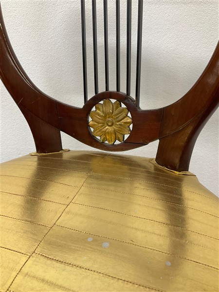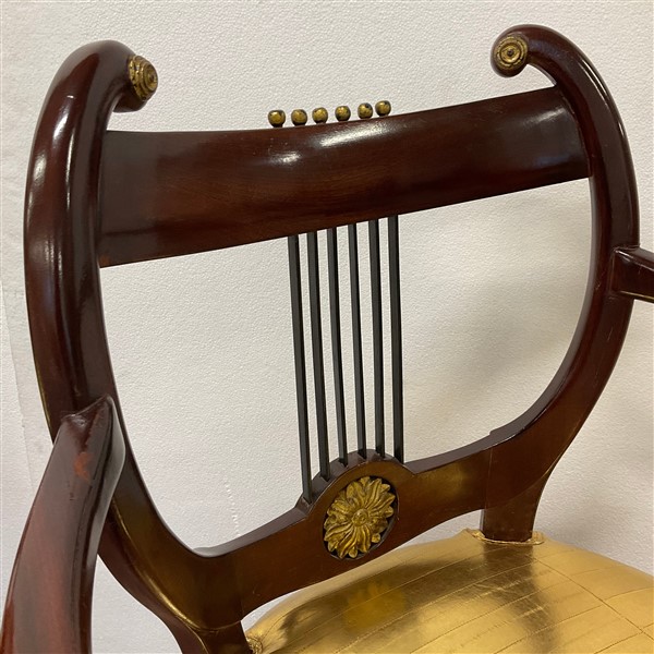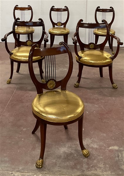 Gruppo di due poltrone (L. max cm 63) e quattro sedie in mogano e legno dorato con schienale a lira e piedi anteriori terminanti a zampa ferina. Sedute rivestite in tessuto dorato (difetti e mancanze)