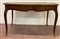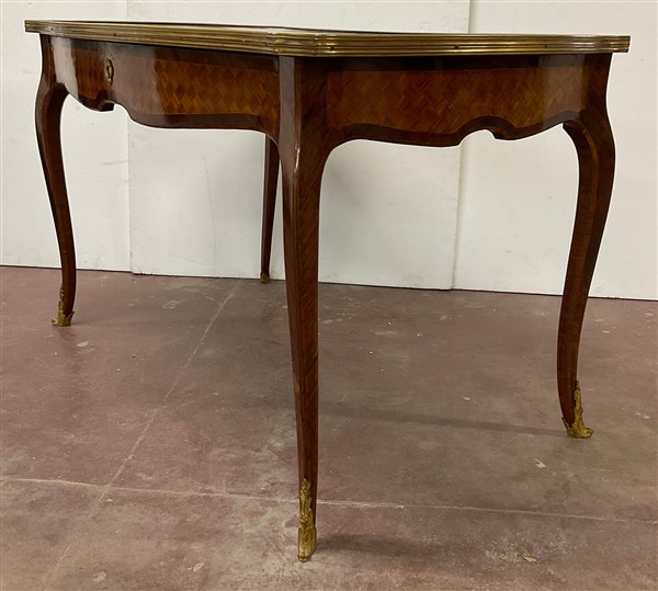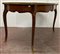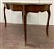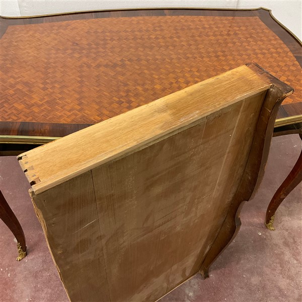 Tavolo scrittoio da centro intarsiato in legni vari a marqueterie. Piano sagoma