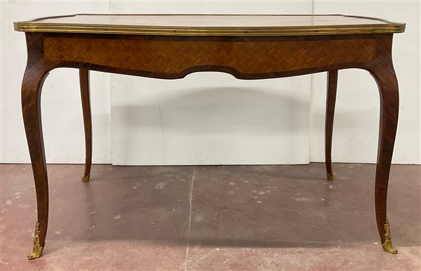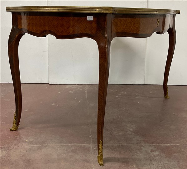 Tavolo scrittoio da centro intarsiato in legni vari a marqueterie. Piano sagomato, un cassetto nella fascia. Scarpette e ciglio in metallo dorato. Inizio sec XX (cm 120x75x76,5) (lievi difetti)
