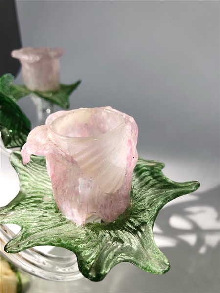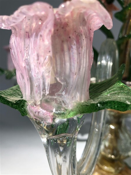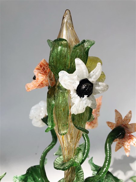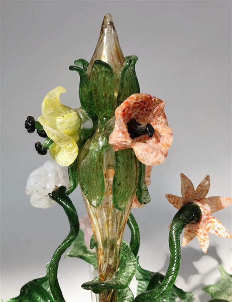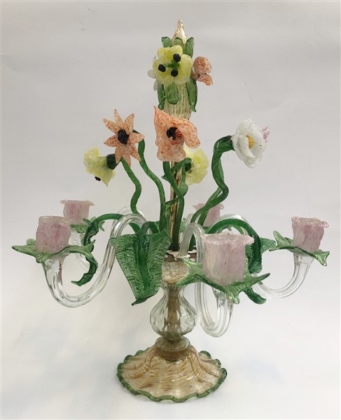 Manifattura di Murano. Candelabro da tavolo in vetro soffiato policromo, a cinque bracci con decoro a fiori e foglie. Secolo XX (h cm 51)(difetti)