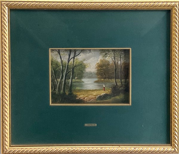 Ignoto del XX secolo "Paesaggio fluviale con figure" olio su compensato (cm 1