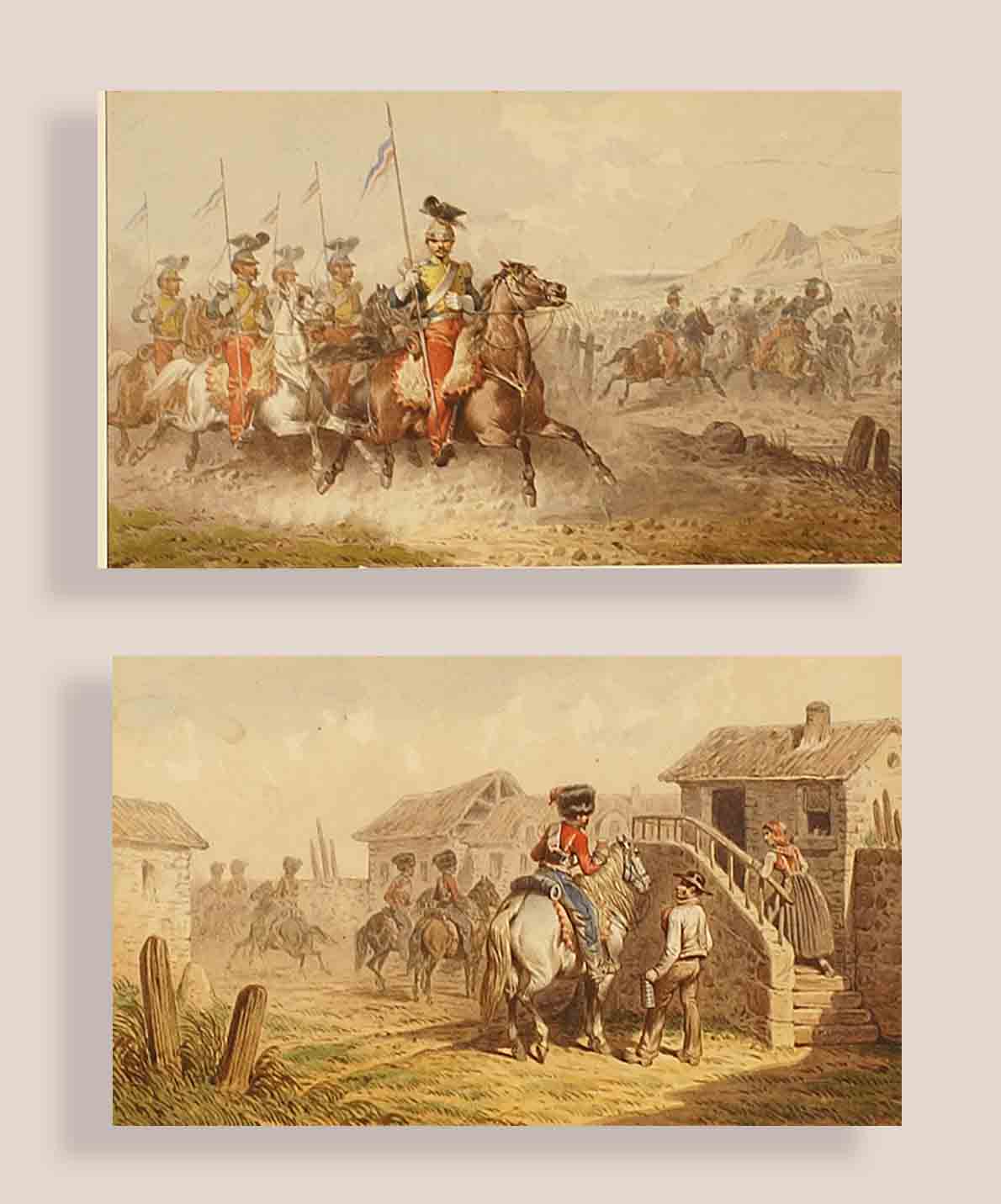 Scuola francese del XIX secolo, coppia di acquarelli raffiguranti scene militari, cm. 14x23 (difetti).