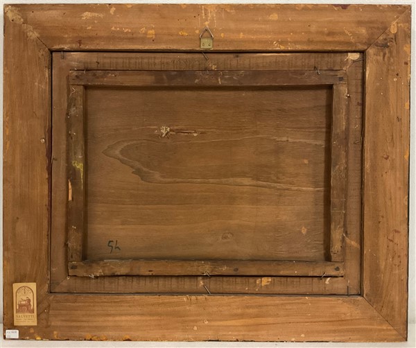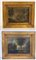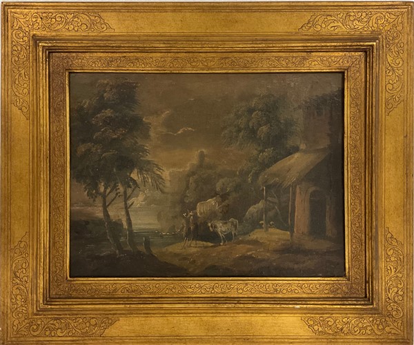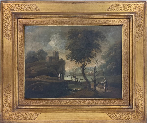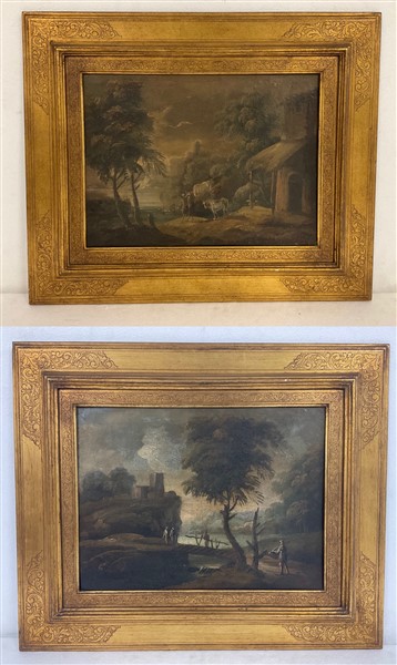 Scuola del XVIII secolo, coppia di dipinti raffiguranti paesaggi con figure, oli su tela applicata su compensato (cm 35,5x48 ciascuno) in cornici (difetti e restauri)